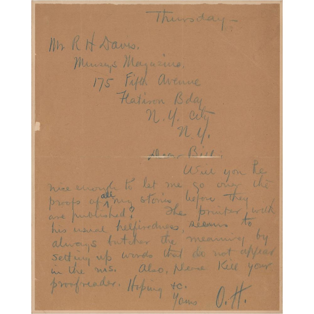 Sought-after ALS in pencil, signed “O. H.,” one page, 8 x 10, no date. Letter to R. H. Davis of Munsey's Magazine, in full: "Will you be nice enough to let me go over the proofs of my stories before they are published? The printer with his usual helfiredness, seems to always butcher the meaning by setting up words that do not appear in the MS. Also, please kill your proofreader." The letter is affixed to a slightly larger cardstock mount. In very good to fine condition, with three small areas of paper loss.