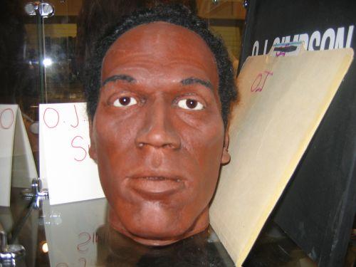 O.J. SIMPSON wax head. Includes colored photos of OJ Simpson wax