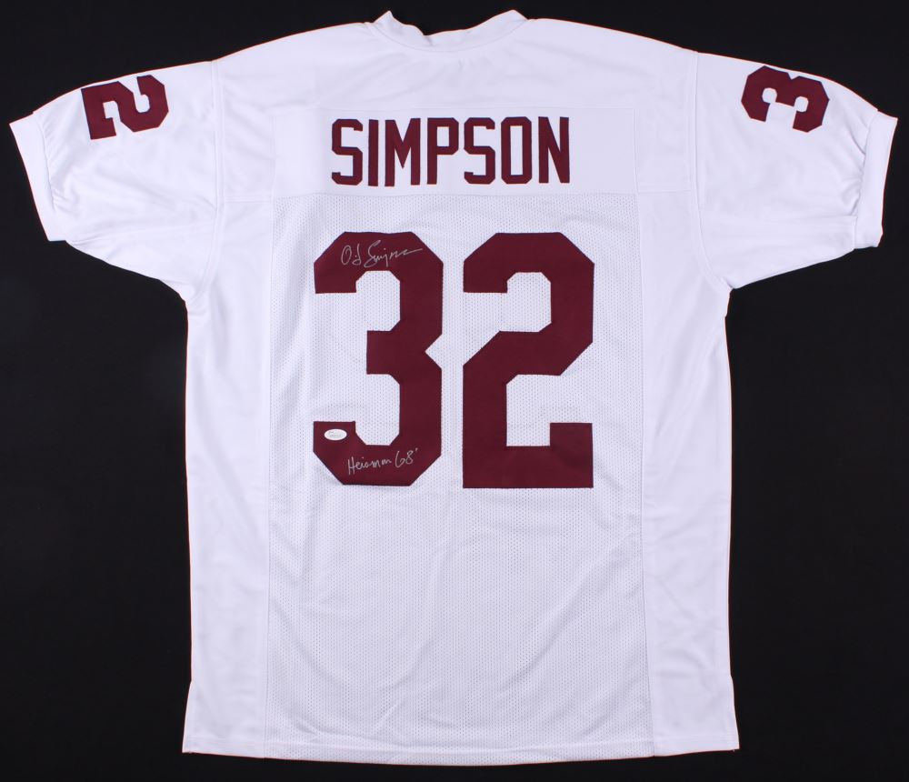 Custom on-field style jersey. Everything is sewn on, size XL. Hand-signed and inscribed in silver paint pen by O.J. Simpson (HOF).
