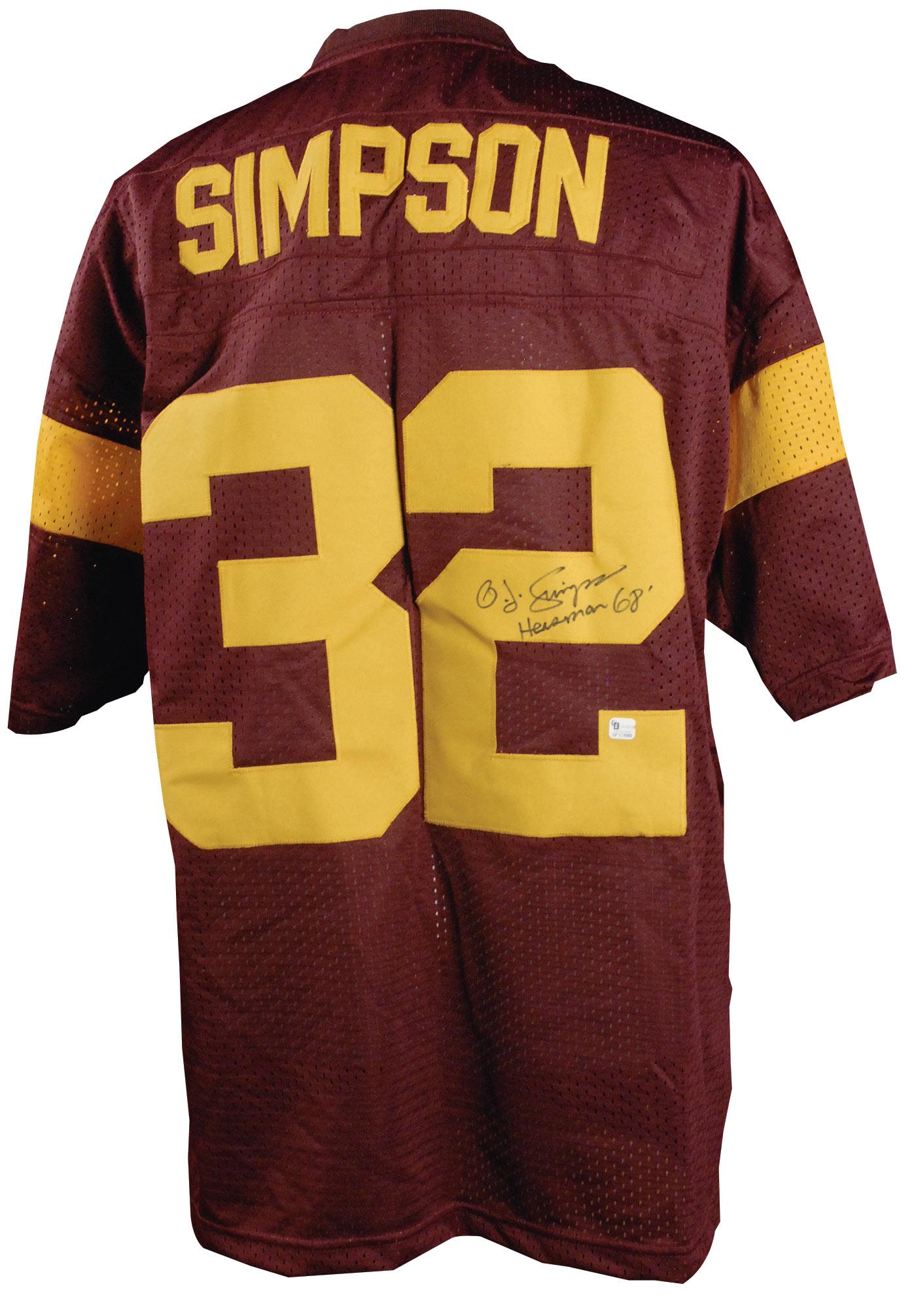Replica USC football jersey, with sewn on letters and numbers, signed in black felt tip on the number on the back, “O. J. Simpson, Heisman 68.” In fine condition.