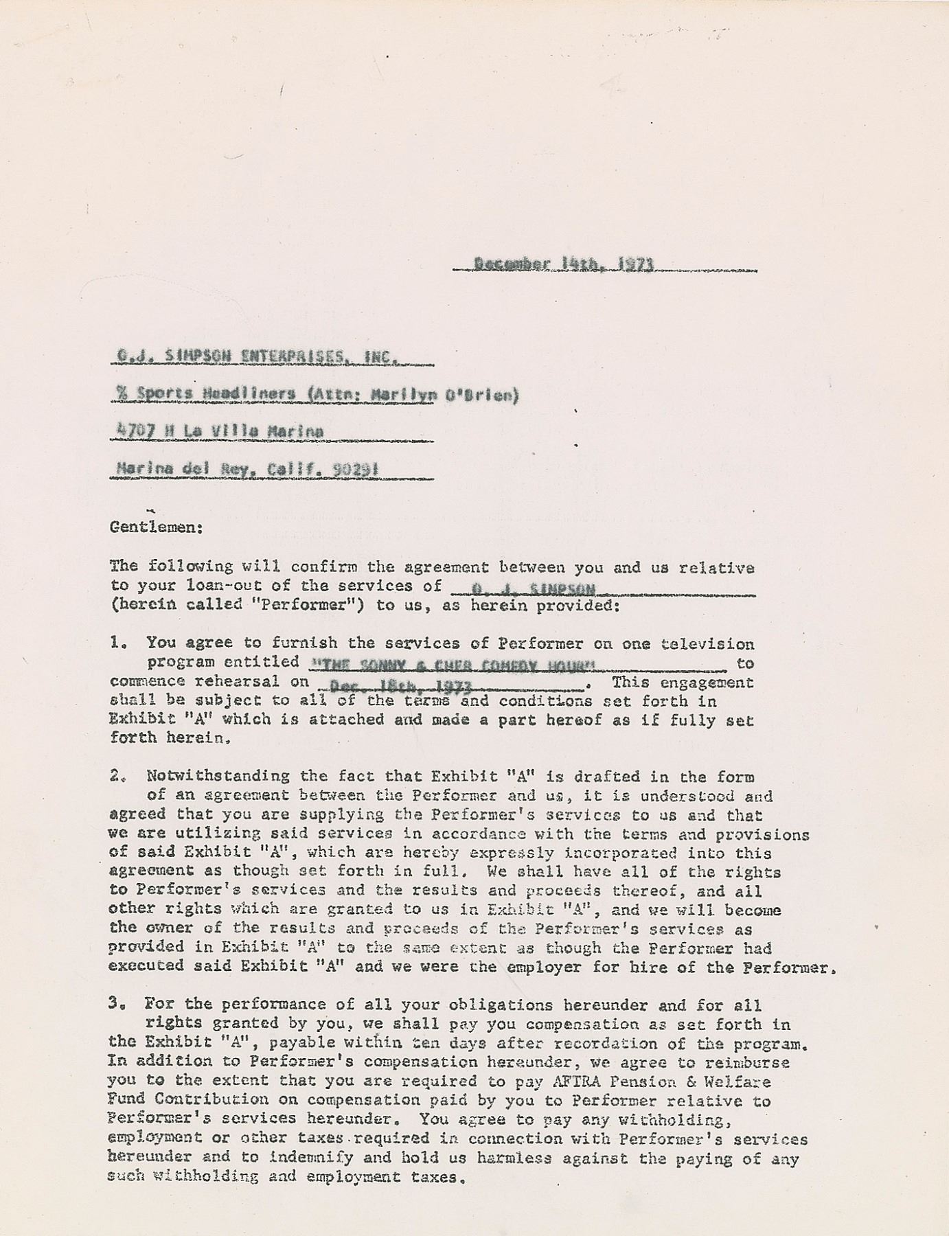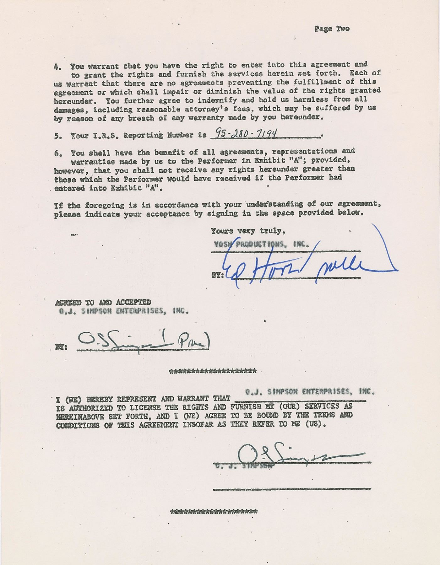 Twice-signed DS, two pages, 8.5 x 11, December 14, 1973. Loan-out agreement between Yosh Productions and O. J. Simpson Enterprises for the services of Simpson as a "Performer on one television program entitled 'The Sonny & Cher Comedy Show' to commence rehearsal on Dec. 18th, 1973. Signed twice at the conclusion by Simpson in black felt tip, adding "(Pres)" to the end of one signature. In fine condition.