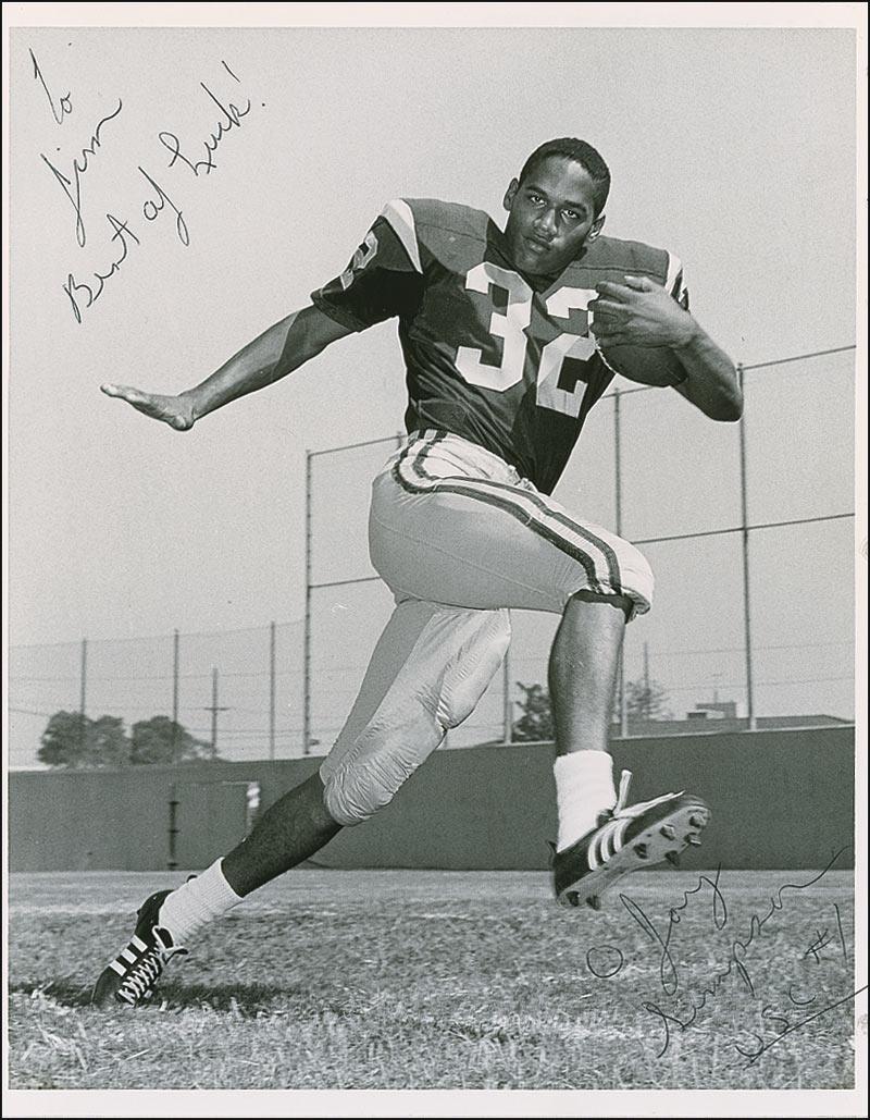 Glossy 8 x 10 photo of Simpson from this college playing days, uniquely signed and inscribed in black ink “To Jim, Best of Luck! O. Jay Simpson USC #1.” In fine condition, with dings along the right edge.