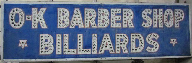 O-K Barber Shop Billiards Tin Outdoor Can Sign. Overall good condition. 95 X 28 1/2 X 9 inches.