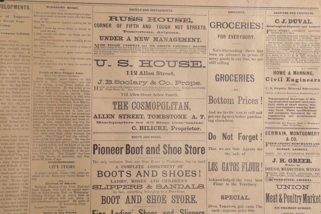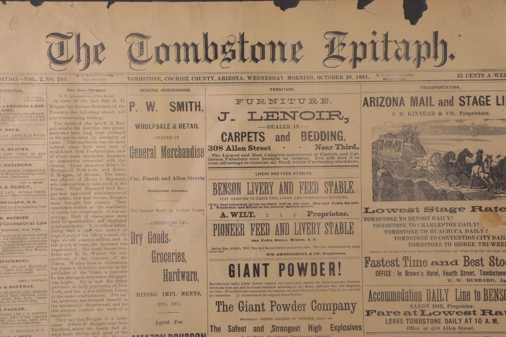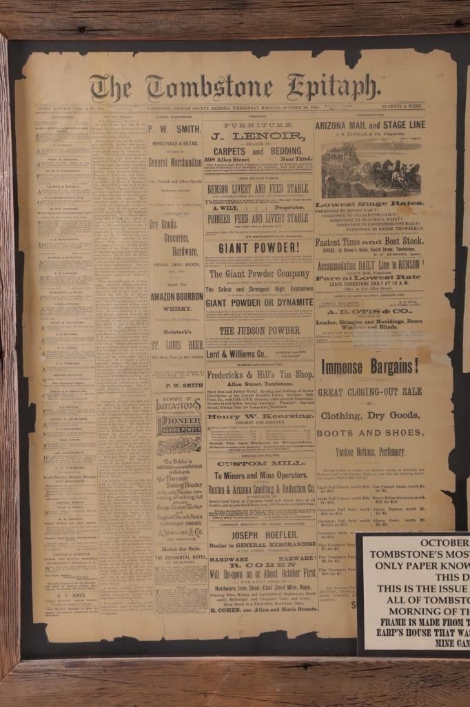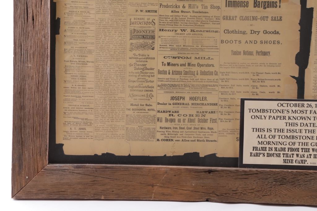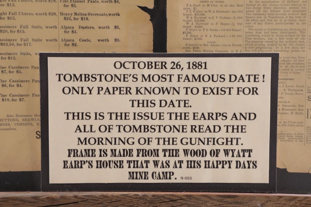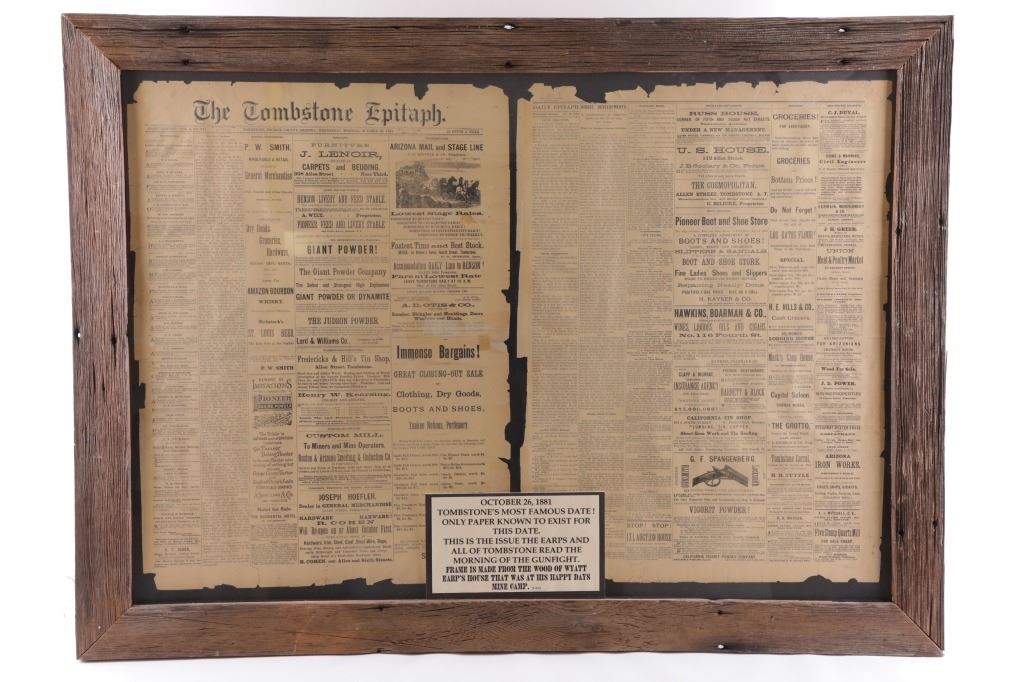 This is the original paper from the O.K. Corral Shootout Day of October 26, 1881, from the Tombstone Epitaph, marked by the museum as one of the only examples to exist; Provenance: From the Tombstone Western Heritage Museum in Tombstone, Arizona. The newspaper is Unique and Rare being the issue distributed on the day of the shootout at the O.K. Corral (according to research and The Tombstone Epitaph website a special issue was printed latter that day with word of the shooting). This issue would have been read by all the citizens of Tombstone the morning of the 26th prior to the 3pm shootout. This is the only paper known to exist from the morning of Oct. 26, 1881 with the Gunfight Special printed later in the day with testimonial and eyewitness accounts. This printing was delivered before the gunfight happened at the O.K. Corral and is unique for being framed with reclaimed wood from Wyatt Earp's house that was at this Happy Days mine camp. The condition of this The Tombstone Epitaph newspaper is well preserved with some tears to the paper and browning to the pages consistent with the age of the paper but otherwise shows a well preserved condition. The measurements of this framed newspaper is 29 7/8" x 41" and the visible newspaper measures 24 3/4" x 36". The collective weight of this framed newspaper is 13lb 14oz.