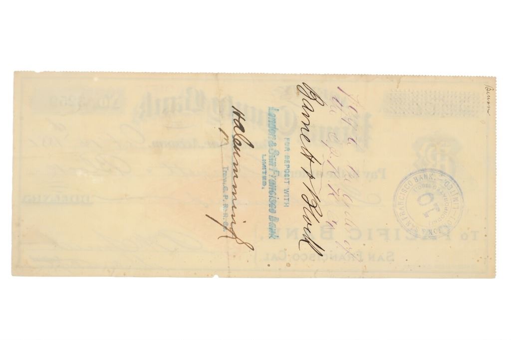 Featured in this lot is this Tombstone, Arizona: Rare bank draft cashed the day after the Gunfight at the O.K. Corral October 27th, 1881; Provenance: From the Tombstone Western Heritage Museum in Tombstone, Arizona. This check features a wonderfully and professionally crafted construction that shows a cut check from the Pima County Bank pay to the order of Barnett & Block for $500.00 and signed on the back "Pay to the order of the C.P.R.R. Co". The check is signed at the bottom by the Bank Manager and is stamped in the top right hand corner that it had been cashed at Pacific Bank in San Francisco Oct. 27, 1881. Documents from Tombstone bearing this date are quite rare. The check comes with an original museum tag that reads as follows: Cashed the day after the gunfight. The condition of this Pima County Bank check is well preserved with no obvious signs of damage and shows a well preserved overall condition. The measurements of this check is 3 3/8" x 8". TTD-36