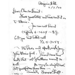 (1887 - 1986) American painter and wife of Alfred Stieglitz, she was a leading artist of the twentieth century whose paintings were devoted to abstract floral forms, desert terrain and animal skulls. Rare A.L.S. "Georgia O'Keeffe", 1+p. 4to., Abioquin, NM, Feb. 7, 1950 to Charles Daniel. She writes, in part: "…I have your letter and have sent it on to Marin…speak with young John Marin first. I heard some time back that old John Marin wasn't so well. He may be alright now. Get your pictures from him…" She adds in her postscript: "Give my greetings to the Ocean!". Folds, else near fine. Painter John Marin had a strong influence of O'Keeffe, and the two often had their works exhibited together. Sold with an 8" x 10" photo showing O'Keeffe on the beach at Fire Island in 1948, accompanied by a signature of the photographer, GEORGE DANIELL. Three pieces.