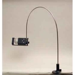 O-LUCE, Mailand Joe Colombo Klemmleuchte Spider 293, Metall, anthrazitfarben lackiert und verchromt. Querrechteckiger Reflektor mit u-förmigem Querschnitt, zwei gerundete Öffnungen, geschwungener langer Schaft. Im Reflektor innen bez.: Firmenmarke mit Zusatz 1967. H.: 135 cm, Entw.: 1966
