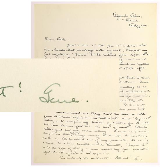 O'Neill, Eugene (1888-1953) American playwright; he won four Pulitzer Prizes for Drama and the 1936 Nobel Prize for Literature. Autograph Letter Signed "Gene," 1 page, 11 x 8½ in., Belgrade Lakes, Maine, Friday evening (September 1926). To Richard Madden, O'Neill's literary agent. In part: "Just a line to tell you to inform the Actors bunch, as always with my cuts, I expect my full royalty of 'Brown' to be restored from Sept. 1st on. And don't let McKaig give you any argument on it. Also warn them they are way behind hand on royalties again….We'll hold off the Guild until I get back to town around Oct. 1st and have a talk with them. There's no hurry since they're frank about not wanting to do it this season. I'll also have a personal interview with Miller. Nathan has wanted to bring us together for some time…I can take the opportunity to talk 'Marco' to him too….Kenneth [Macgowan] wired me today that he had a cable from [Max] Reinhardt saying he was enthusiastic about 'Lazarus L[aughed]' asking us to postpone any decision of director for it until his man [Rudolph]Kommer gets here the last of month….I can't wait much longer on their (Actors) raising money to do it, Reinhardt or no R., or I'll be dished out of any production the coming season. As I have pointed out to Kenneth, 'Lazarus L' isn't the type of thing anyone would buy for production after the 1st of Feb. - too expensive…" Fine.