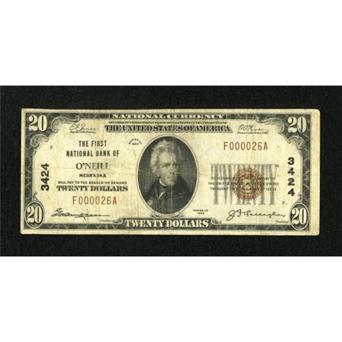 <B>O'Neill, NE</B></I> - $20 1929 Ty. 1 <B>The First NB</B></I> Ch. # 3424<BR> This is one of 11 small in the census, but without a grade until now. This is only the second time that a Series 1929 note on this Holt County bank has crossed the auction block. <B>Very Fine.</B></I><BR><I>From The Kansas City Collection</B></I><BR><BR><b>Shipping:</b> Coins & Currency (<a target="_blank" href="http://www.heritageauctions.com/common/shipping.php">view shipping information</a>)