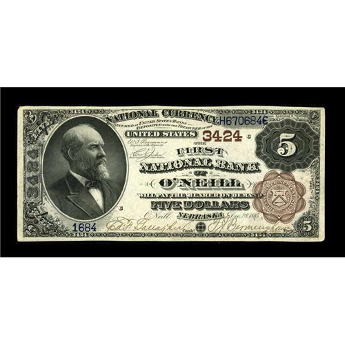 <B>O'Neill, NE</B></I> - $5 1882 Brown Back Fr. 469 <B>The First NB</B></I> Ch. # 3424<BR>A fresh and original $5 Brown Back with everything a collector could want, including vibrant colors, bold pen signatures, a neat layout, and great eye appeal. The corners are a bit rounded and there is a touch of handling, but this beautiful piece is certain to please its fortunate new owner. <B>Crisp Uncirculated.</B></I><BR><BR><b>Shipping:</b> Coins & Currency (<a target="_blank" href="http://www.heritageauctions.com/common/shipping.php">view shipping information</a>)