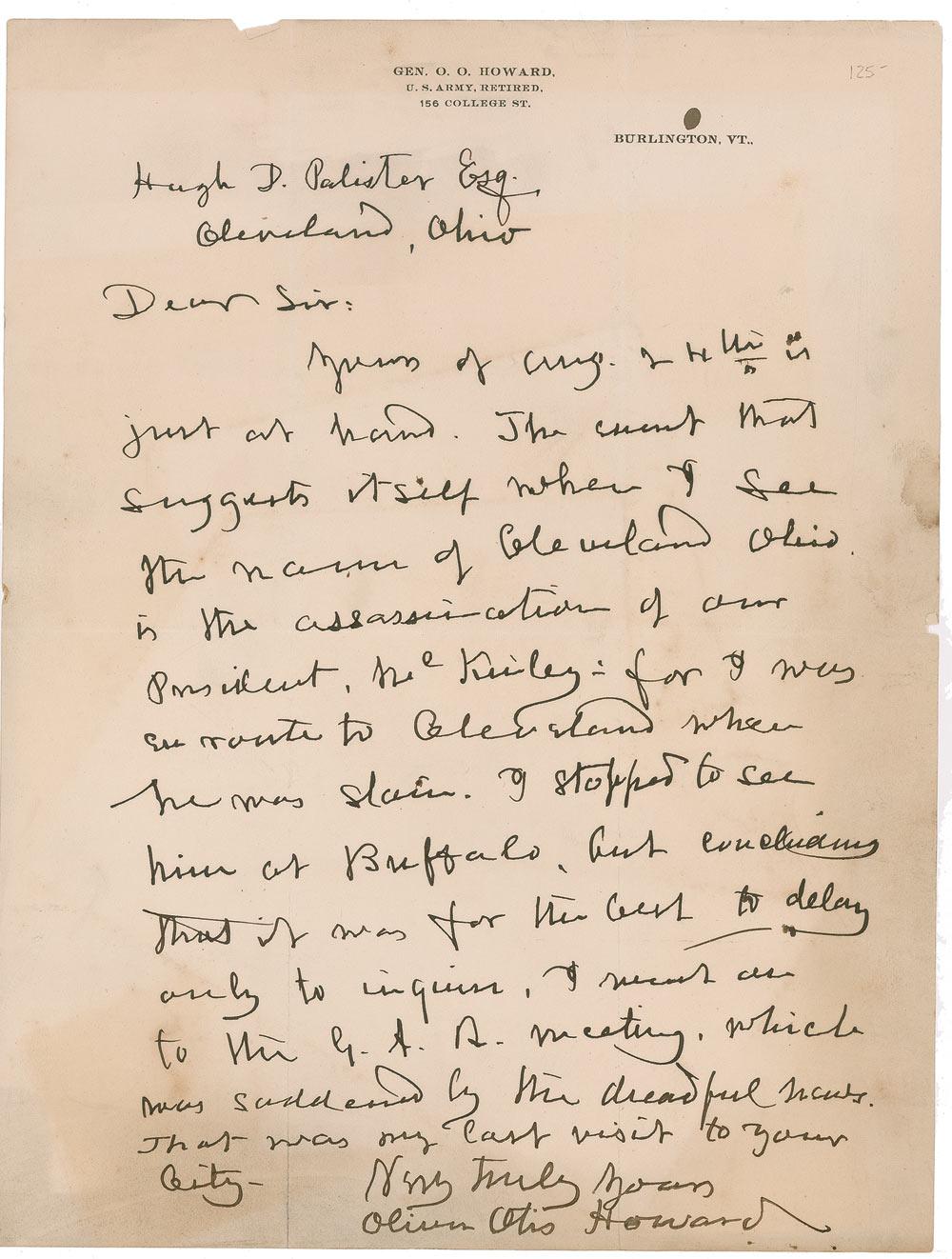 One-armed Union general (1830–1909) who participated at Gettysburg and commanded the Army of Tennessee during Sherman’s March to the Sea. ALS signed “Oliver Otis Howard,” one page, 8.5 x 11, personal letterhead, no date, but postmarked August 25, 1903. Letter to a gentleman in Cleveland. In part: “The event that suggests itself when I see the name of Cleveland Ohio is the assassination of our President McKinley—for it was en route to Cleveland when he was slain. I stopped to see him at Buffalo, but concluding that it was for the best to delay only to inquire, I went on to the G.A.R. Meeting, which was saddened by the dreadful news. That was my last visit to your city.” In very good condition, with intersecting folds, one through a single letter of signature, scattered toning and soiling, heavier along edges, and a few creases and edge tears. Accompanied by the original mailing envelope. Interesting recollection of a tragic turn-of-the-century event.
