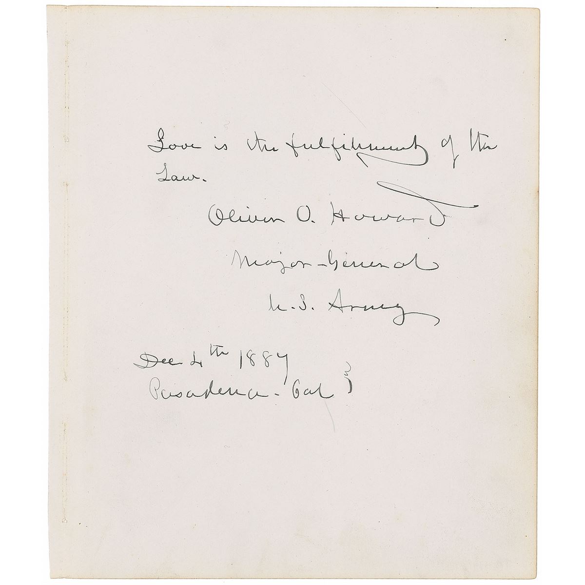 AQS on an off-white 7 x 8.25 sheet, in full: “Love is the fulfillment of the Law. Oliver O. Howard, Major–General, U. S. Army, Dec. 4th, 1887, Pasadena, Cal.” In fine condition.