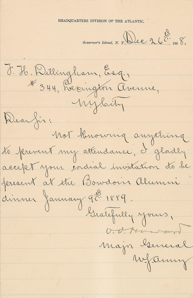 LS, one page, 6 x 9, Headquarters Division of the Atlantic letterhead, December 26, 1888. Response to an invitation, in part: “Not knowing anything to prevent my attendance, I gladly accept your cordial invitation to be present at the Bowdoin alumni dinner.” In fine condition.