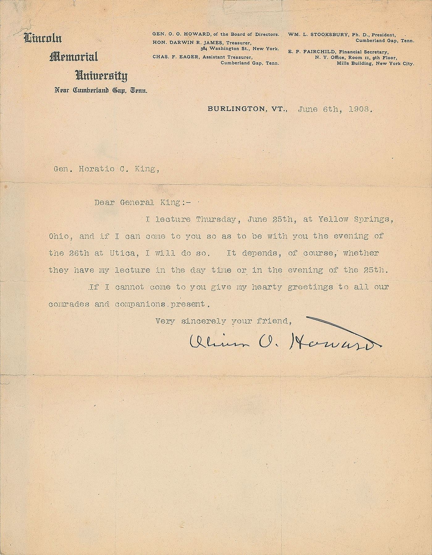 Union general (1830–1909) who participated at Gettysburg and commanded the Army of Tennessee during Sherman’s March to the Sea. TLS signed "Oliver O. Howard," one page, 8.5 x 10.75, Lincoln Memorial University letterhead, June 6, 1908. Letter to General Horatio C. King, in full: "I lecture Thursday, June 25th, at Yellow Springs, Ohio, and if I can come to you so as to be with you the evening of the 26th at Utica, I will do so. It depends, of course, whether they have my lecture in the day time or in the evening of the 25th. If I cannot come to you give my hearty greetings to all our comrades and companions present." In very good to fine condition, with light creasing and old mounting remnants along the edges of the reverse. Accompanied by an engraved portrait of Howard bearing a preprinted signature.