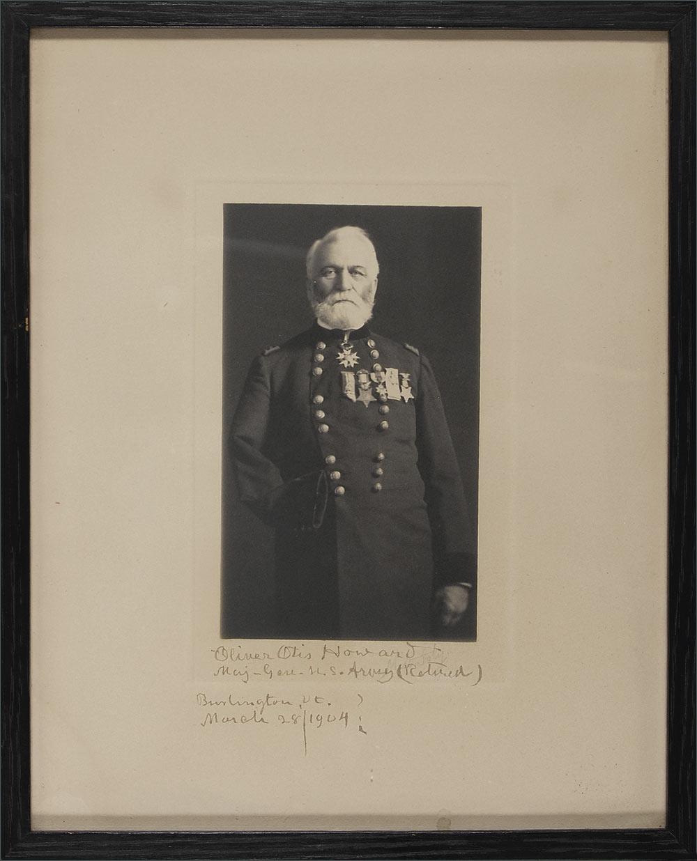 One-armed Union general (1830–1909) who participated at Gettysburg and commanded the Army of Tennessee during Sherman’s March to the Sea. Vintage matte-finish 8 x 9.75 photo of Howard in full military uniform, after the amputation of his right arm, signed in the lower border in black ink, “Oliver Otis Howard, Maj-Gen. U. S. Army (Retired), Burlington, Vt. March 28, 1904.” Framed to an overall size of 8.5 x 10.5. In fine condition. Pre-certified PSA/DNA and RRAuction COA.