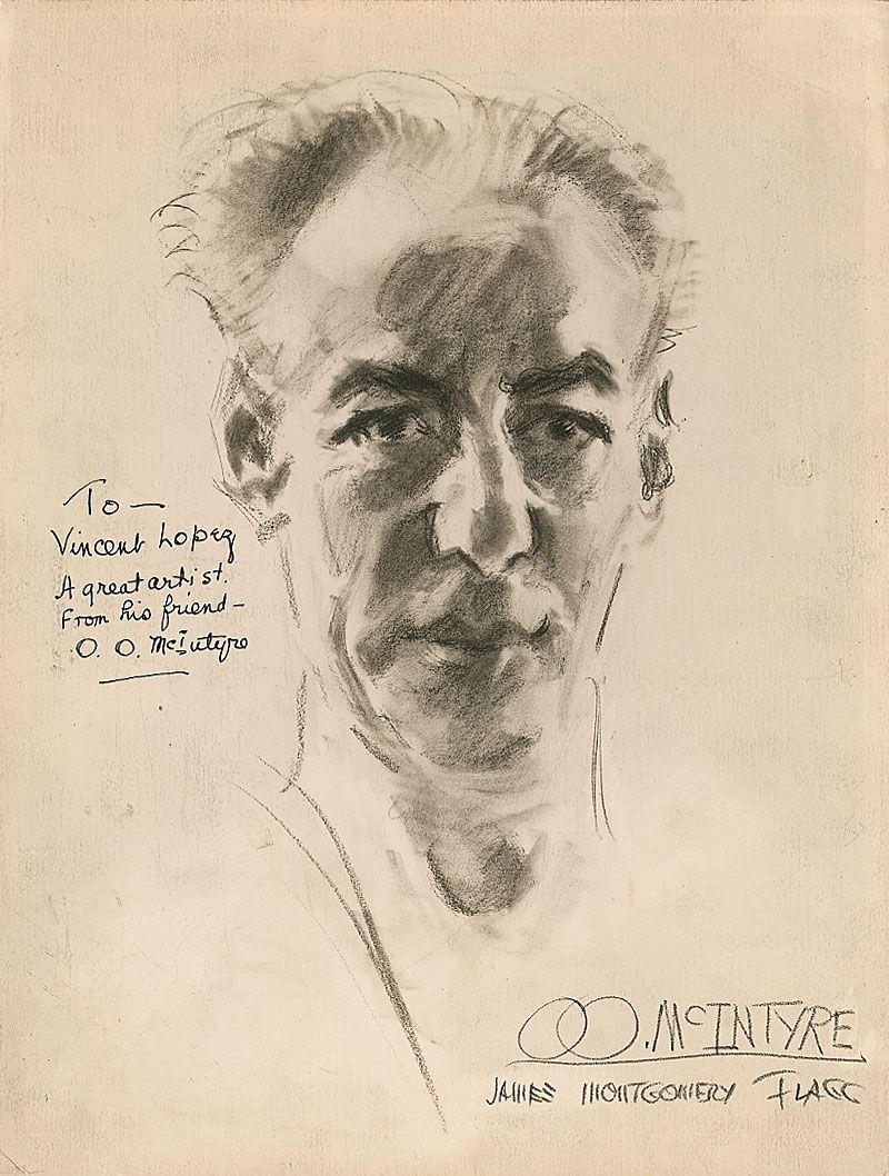 Print of a charcoal portrait of McIntyre by James Montgomery Flagg, 10.5 x 13.5, signed and inscribed in black ink, “To—Vincent Lopez, A great artist. From his friend—O. O. McIntyre.” Light scattered creases and soiling, otherwise fine condition.
