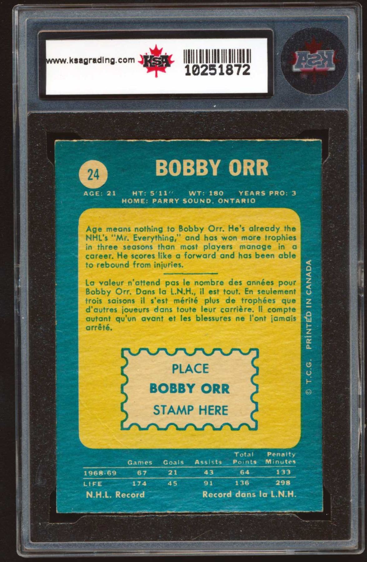 Bobby Orr #4 , of O-Pee-Chee Company #24 (1969-70) graded by KSA: 4 VGE # 10251873.