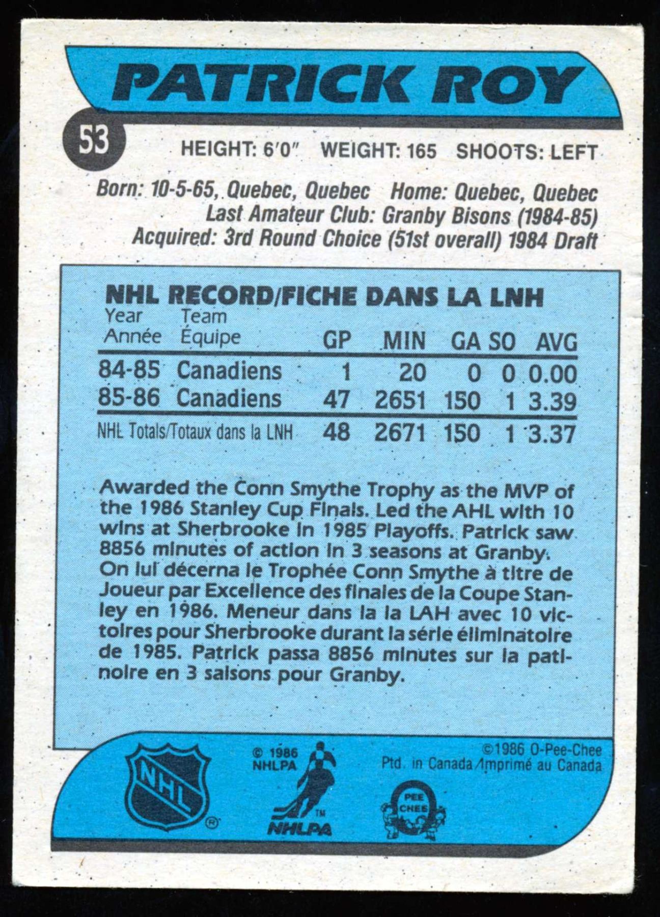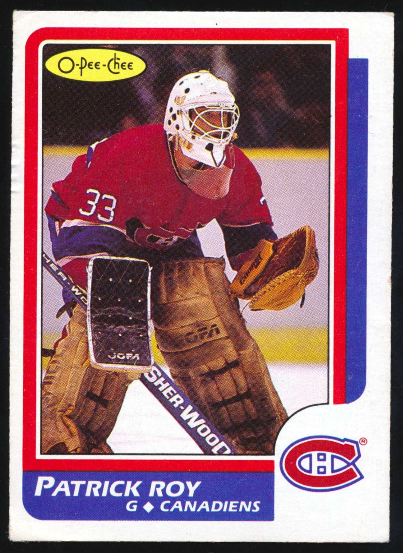 Patrick Roy #33, with the Montreal Canadiens (1986-87) , O-Pee-Chee company card #53.