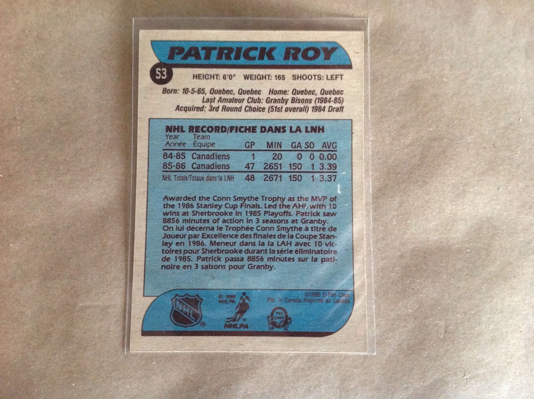 1986 Montreal Canadiens Goal Tender - Patrick Roy Hockey Card
