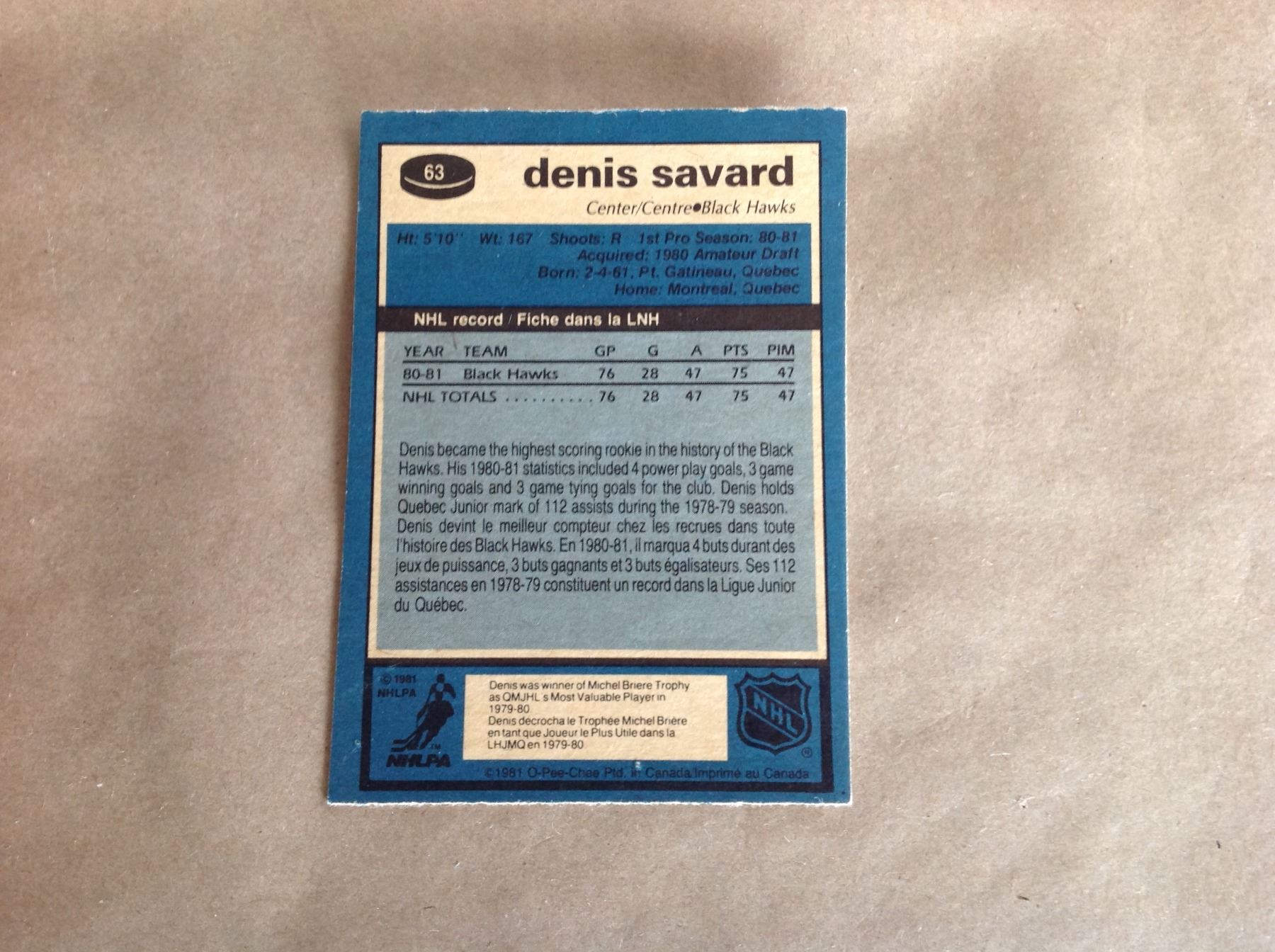 1980/81 Chicago Black Hawks Highest Rookie Scoring Hockey Card "In The History of the Blackhawks" * Denis Savard