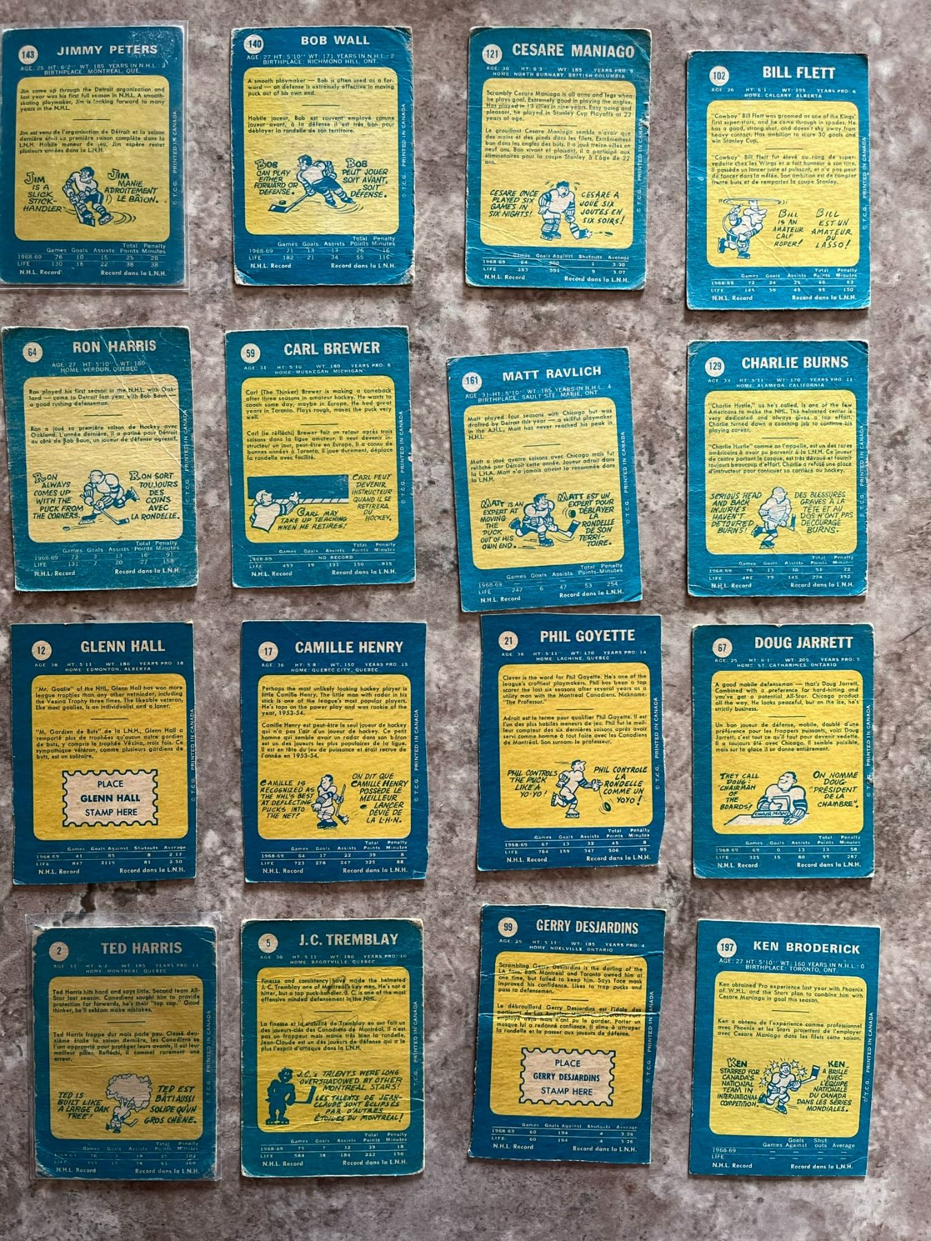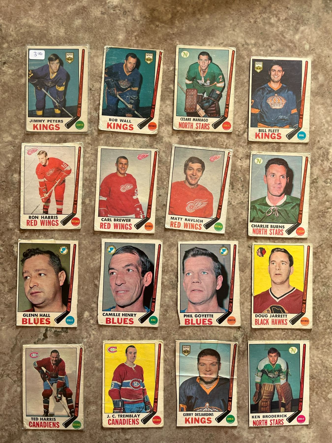 O Pee Chee lot of 16 1969-70 Hockey Cards. Poor condition with soft corners, creases and tape marks. 55 years old!