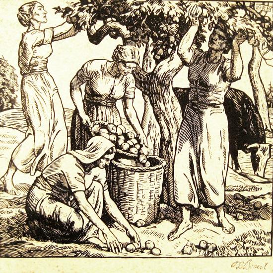 O. R. Bonert, French Art, , Fruit-Picking, Woodcut, 31x32cm, Stamped signed., , , , ,