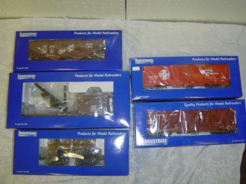 Industrial Rail # 027 IDM1702 40' Work Caboose (BN), IDM8002 027 Skeleton Log Car w/logs Black, 3003 027 Stock Car Chicago Northwestern, # 1010 027 Sante Fe Box Car Super Shocker, # 4005 027 Hopper w/load Burlington Route