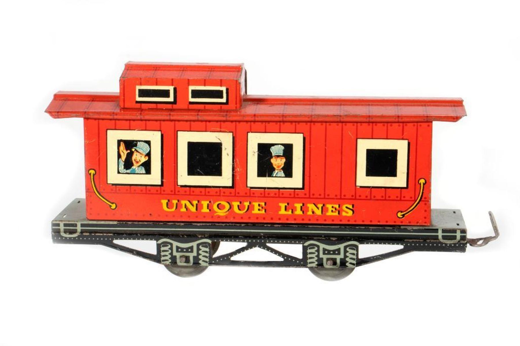 Unique Lines Caboose - intact. El Camino Real Bell model - used. Marx accessories - used.
