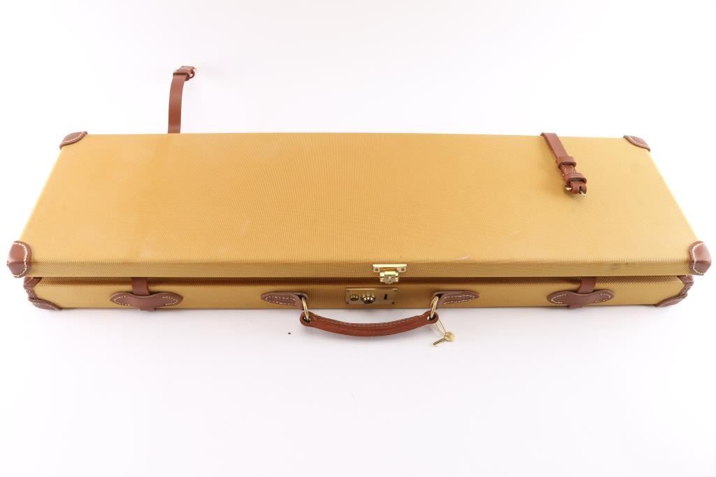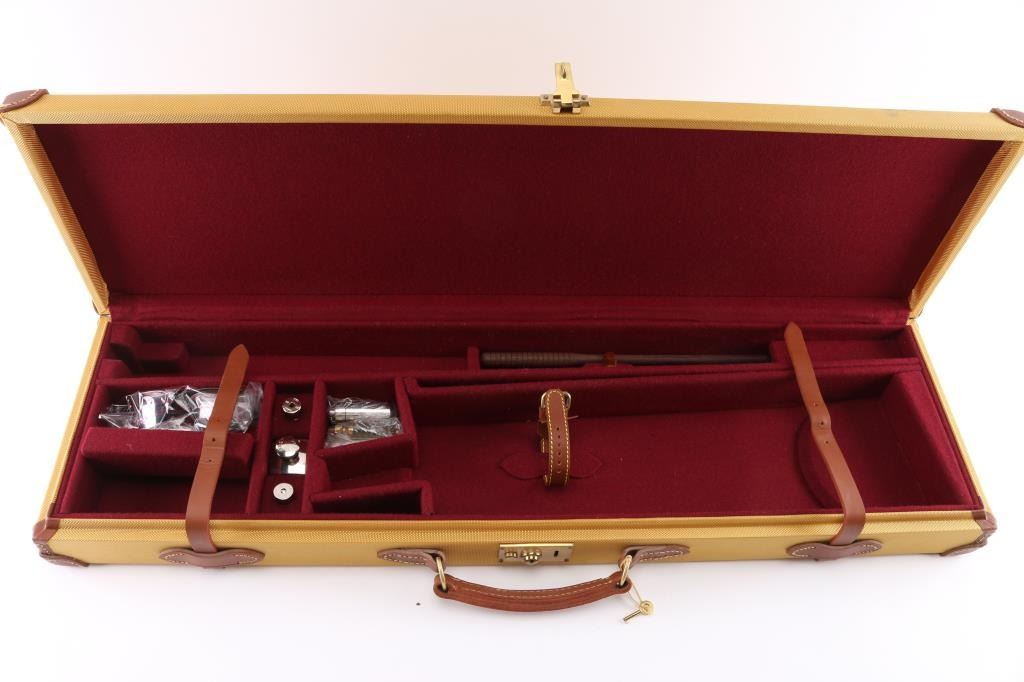 High quality break open over under shotgun case. Wood construction with tan canvas covering, stitched brown leather corner protectors, double straps and form fitted wine colored felt lining. Square nickel plated oil bottle, 2 piece rosewood cleaning rod with brass brush, wool mop, split jag, a pair of nickel snap caps in 28 gauge. Shooting glasses still in packaging. One key included. Case was originally for a Connecticut Shotgun MFG. Co. shotgun. Measures 33"-L, 9 1/2-W and 3 1/4"-H. Accepts barrels up to 30". Like new condition.