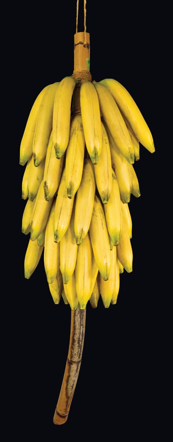 (1970s) Once a staple of the Poly-Pop commercial decor world, these hand fabricated plastic banana bunches are more scarce than one would think. These were hand made at OA and took between 50 and 60 bananas to wire onto the rattan stalk. Another important part of any Tiki bar decor. 39"x12". VG+ with typical wear.