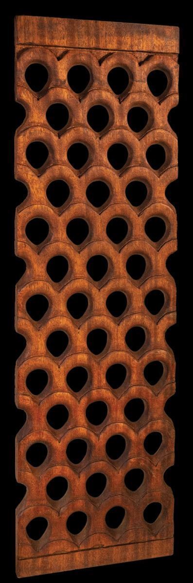 (1960s) OA is well known for their carved room screen panels. This one carved to evoke the design pattern of a pineapple skin pattern. These were first created for Hawaii's Inter-Island Resorts and became a standard catalog item. Double sided.40.5"x12"VG+ with typical wear