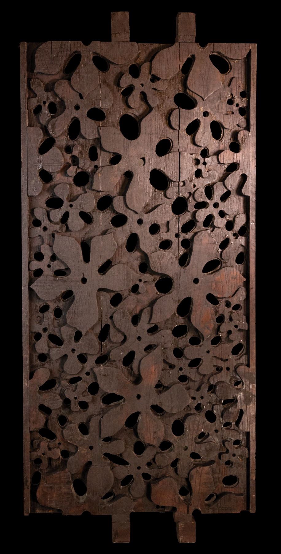 (1960s) LeRoy created this famous OA pattern using a clever application of various depths with his router drill. The final effect is a three dimensional overlap of the flower pattern which also creates a very 1960s effect. Pure Schmaltz! Pure OA! 54"x24". VG+ with typical wear.