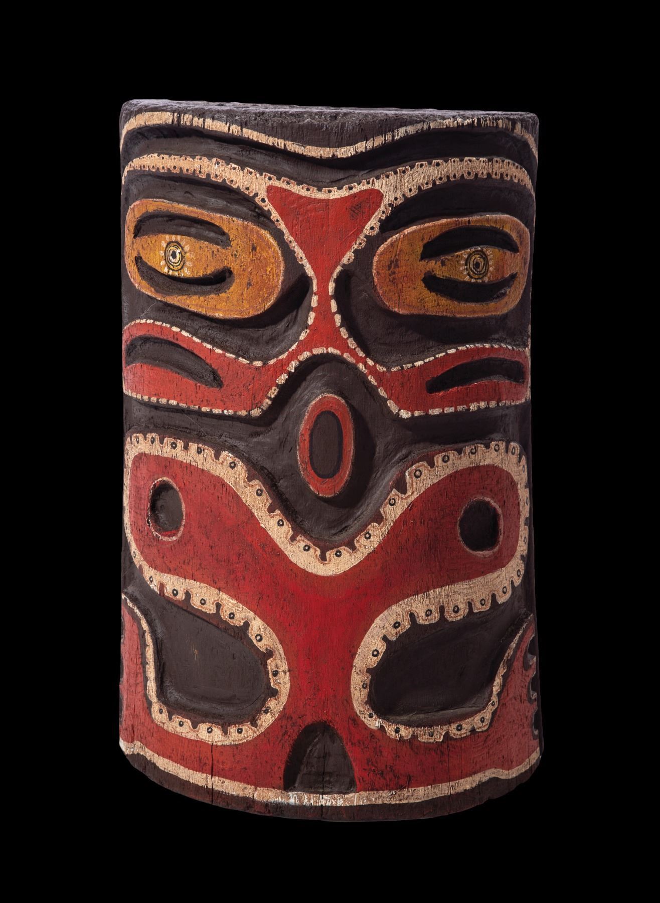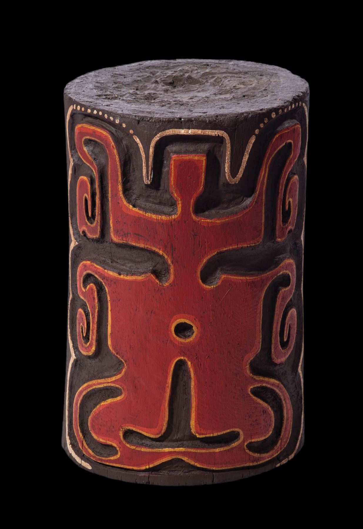 (2000s) An interesting amalgamation tiki consisting of several design influences by LeRoy Schmaltz. There are Aboriginal, Hawaiian and Samoan elements in this interesting one-off tiki by LeRoy. 18"x12". VG+ with typical wear.
