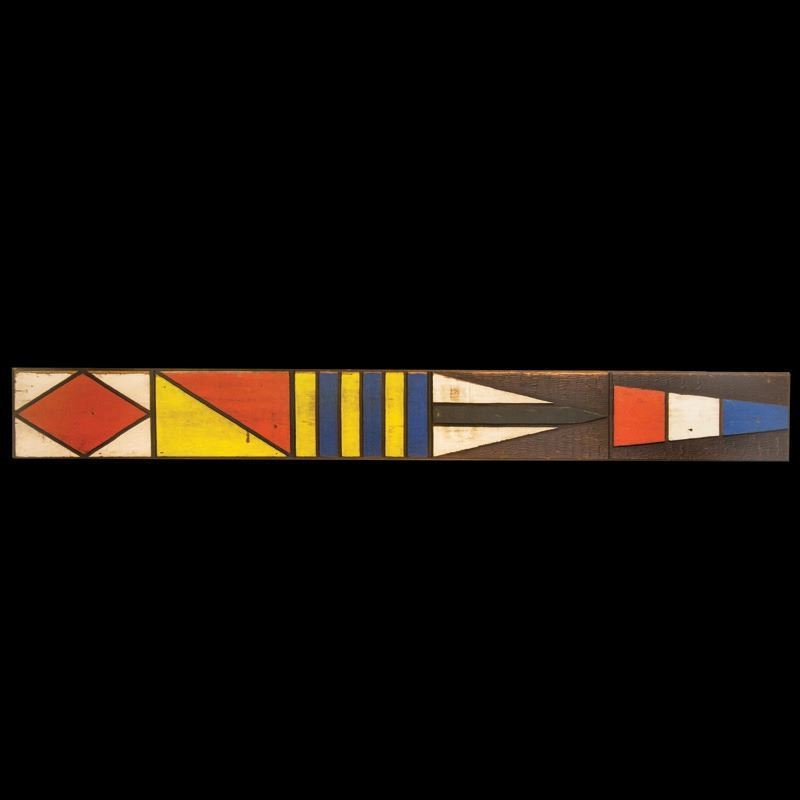 (1960s) These panels were created by LeRoy Schmaltz as part of the Nautical Dept offerings to help commercial designers work nautical themes into their jobs with low profile, yet effective results. Here, ships signal flags are used for either vertical or horizontal placement. These could be found at Jolly Roger Restaurants, The Queen Mary in Long Beach, CA and all three SeaWorld parks.12"x101.5"VG+ with typical wear