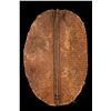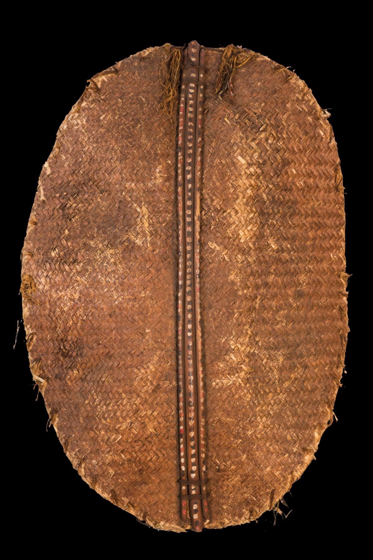 (1960s) A native shield comprised of wood and grass weave. Marked "Luau Party Rentals - Oceanic Arts - Whittier, CA" on the back with hangers. 49"x32". VG+ with typical wear.