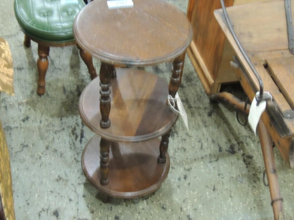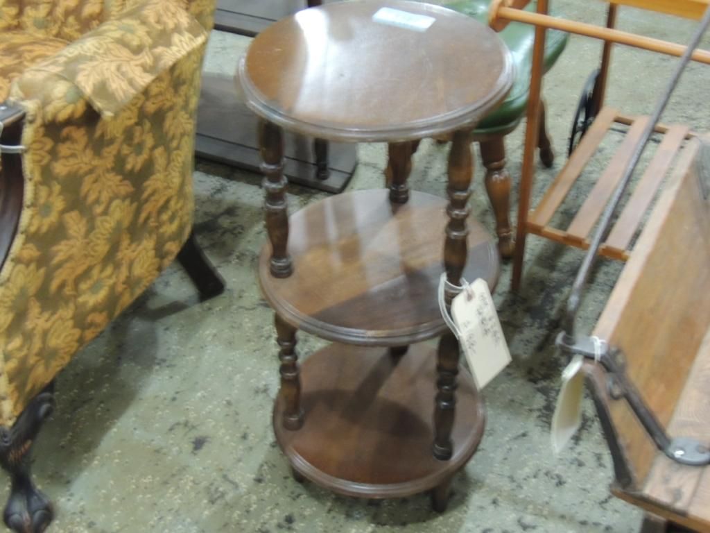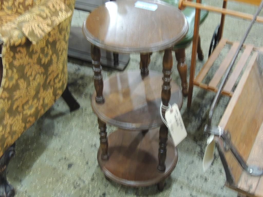OAK ROUND THREE TIER SIDE TABLE. 26" TALL AND 12" DIAMETER. AS SHOWN. SEE PHOTO FOR MORE DETAILS.