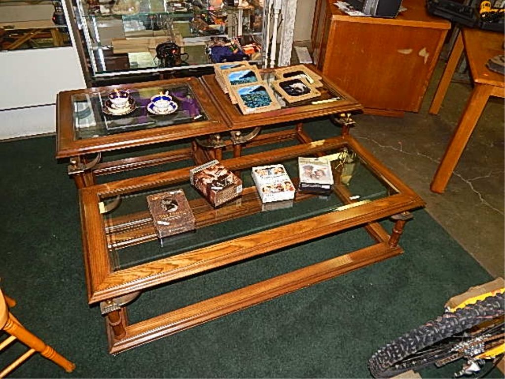 OAK AND GLASS COFFEE TABLE SET - 3 PC TOTAL