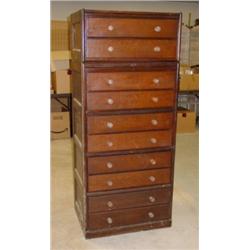 Oak Barrister/Storage chest with removable top and drawers. Total of 10 drawers with glass knobs. Has panel & frame construction, each set of 2 drawers is removable as a set, designed to store documents or maps. It is 76" tall by 28" wide and 21" deep. Removable top section is 14". Has drilled small holes in side where it once had been fastened together. Damaged area to lower left side panel.