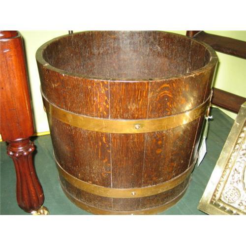 A VERY HANDSOME COOPERED (BRASS BOUND) JARDINERE WHICH WOULD MAKE A FINE LOG BIN BESIDE THE FIREPLACE. IT HAS A CIRCULAR BONE MAKERS LABEL ON THE INSIDE WHICH READS - R.A. LISTER & CO. DURSLEY, ENGLAND. IT HAS THE ORIGINAL RING HANDLES ON EACH SIDE OF THE BIN.