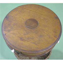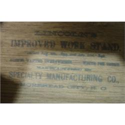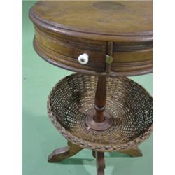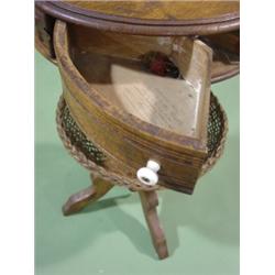 OAK CIRCULAR TOP WORK STAND. 4 drawers. Basket on bottom with acorn finial. Drawers are labeled "Lincoln's Improved Work Stand-Specialty Manufacturing Co.-Morehead City, N.C." 28.75" H, 17" Dia.