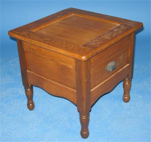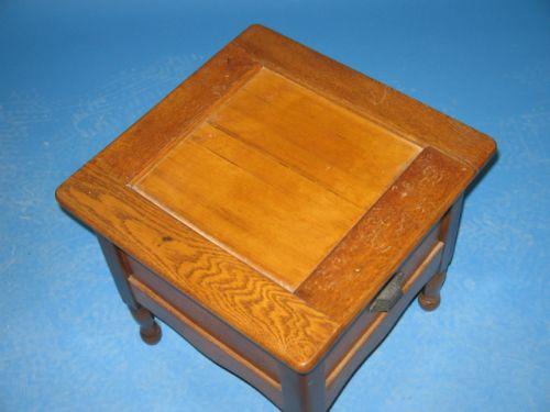 PRIMITIVE OAK COMMODE. Missing porcelain insert. Turned feet. 17.25” H, 17.25” W, 17.25” D