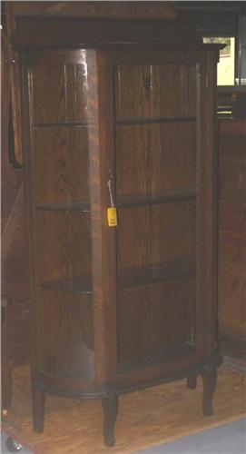 OAK CURVED GLASS CHINA CABINET with original finish height: 63", width: 32 1/2" depth: 12"