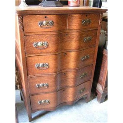6-DWR. OAK DRESSER WITH CURVED DRAWERS.SOME LOCKS ARE MISSING ON THE INSIDE OF DRAWERS BUT DOES NOT AFFECT APPEARANCE NICE GRAIN IN WOOD