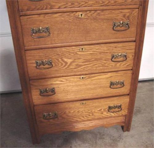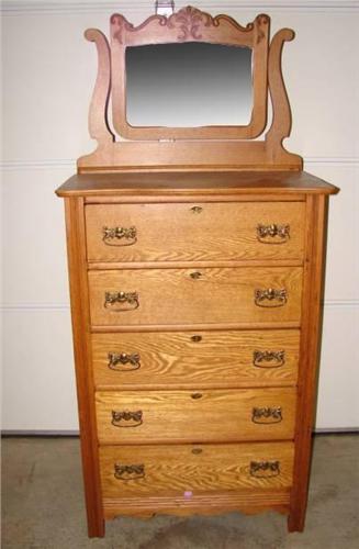 OAK DRESSER WITH MIRROR AT TOP. Has 6 dovetailed drawers. 71" H, 32" W, 18.5" D