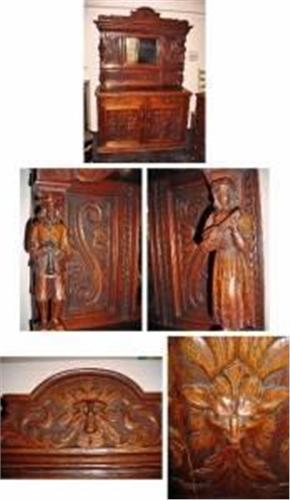 OAK ENGLISH SIDEBOARD WITH OVERHANGING CORNICE CARVED WITH FIGURES AND FOILAGE AND HEAVILY CARVED MOULDING THROUGHOUT FINISHED WITH BRASS HARDWARE. 89"X60"X22"
