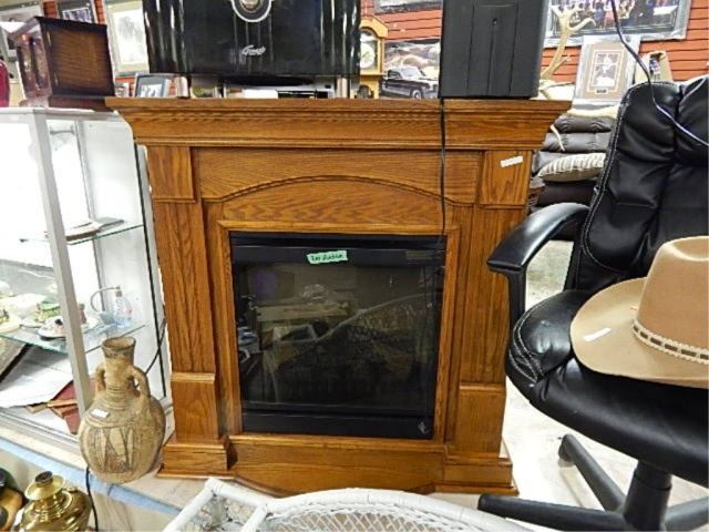OAK FIRE PLACE SURROUND WITH ELECTRIC FIRE PLACE INSERT - REMOTE CONTROL IN OFFICE