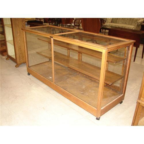 OAK FLOOR MODEL SHOWCASE. Has sliding glass doors at back. Marked with metal plate at top that reads “A.N. Russell & Sons Co.” Showcase is on castors. 37” H, 72.5” L, 24” W