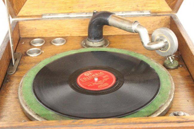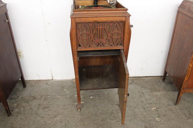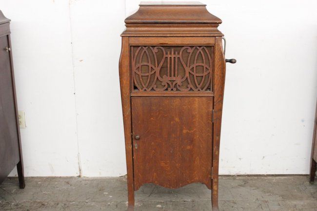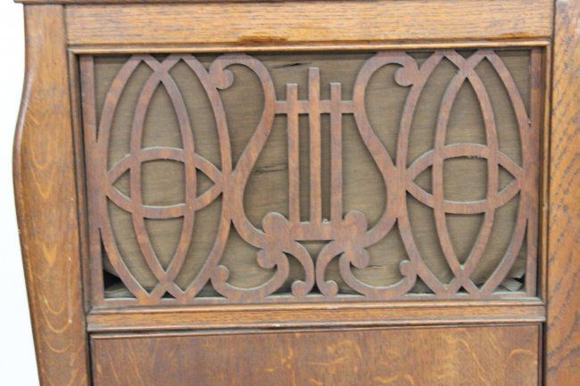 OAK FLOOR MODEL VICTROLA BY SYMPHONOLA W/ ORNATE FRONT WORKS GREAT 45 X 18.5 X 19.5