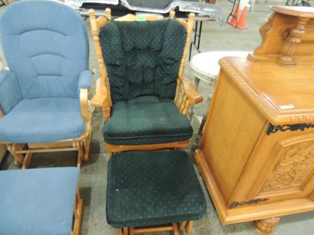 NICE OAK GLIDER ROCKER IN BEAUTIFUL CONDITION, COMPLETE WITH MATCHING GLIDING OR GLIDER FOOTSTOOL OR OTTOMAN. NICE CLEAN GREEN CLOTH COVERING, AS SHOWN.