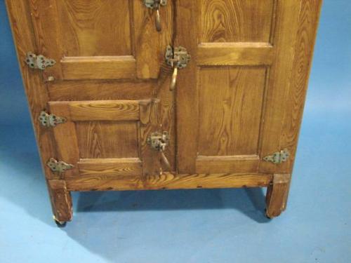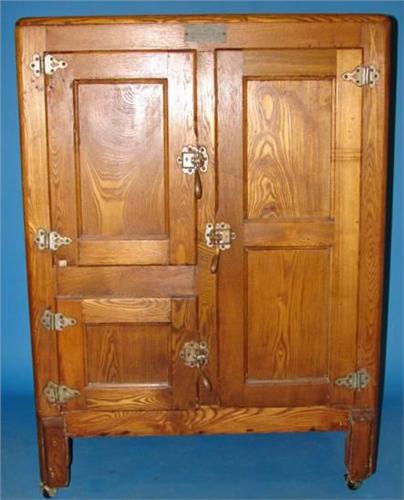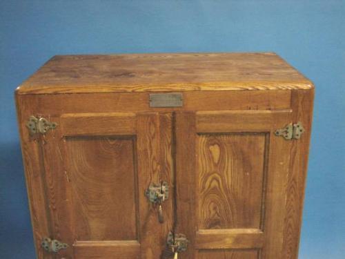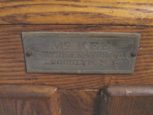 OAK ICE CHEST. Has two doors at left next to single door at right. Marked with metal label at top "McKEE/REFRIGERATOR CO./BROOKLYN, N.Y." Lined with galvanized steel. Has been refinished. Rests on castors. 47" H, 33.5" W, 19" D